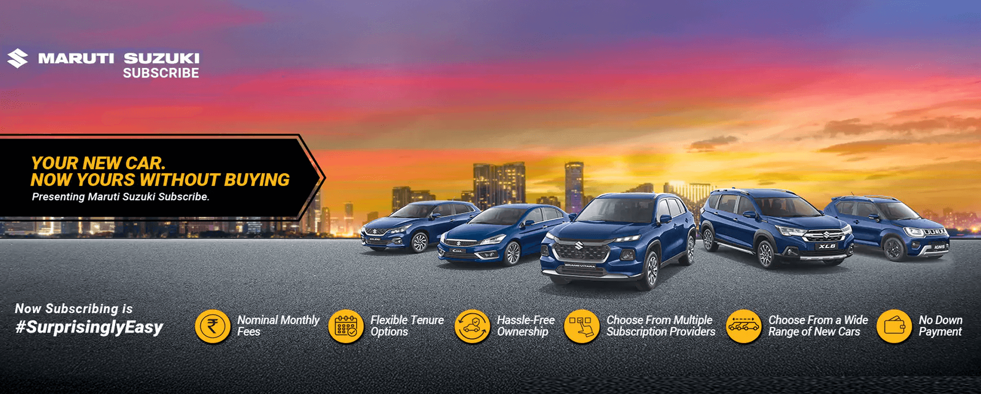 Maruti Suzuki Subscribe enables all customers to enjoy driving their preferred Maruti Suzuki cars without having to deal with all the financial responsibilities that come with owning a car.All you need to do is opt for a monthly subscription plan at a fixed monthly fee, which includes the routine maintenance and insurance costs, and choose a flexible tenure. At Patel Motors in, Neemuch, Neemuch, all Hatchback, Sedan, SUV, the MUV models line-up includes Baleno, Invicto, EVitara, Jimny, Ciaz, Ignis, Fronx, Grand Vitara, XL6. Here, you will enjoy Maruti Suzuki Subscribe benefits such as: